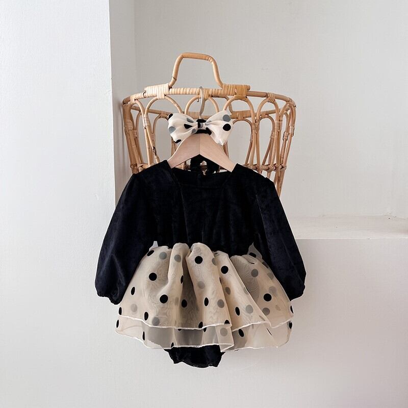 秋の訪れを感じさせるコーデュロイ素材と、キュートなドット柄のオーガンジーを贅沢に使用したロンパースです。
