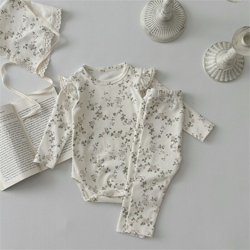 ロンパースとレギンスのセットに、可愛いボンネットが付いており、赤ちゃんのお肌にも優しい素材です。