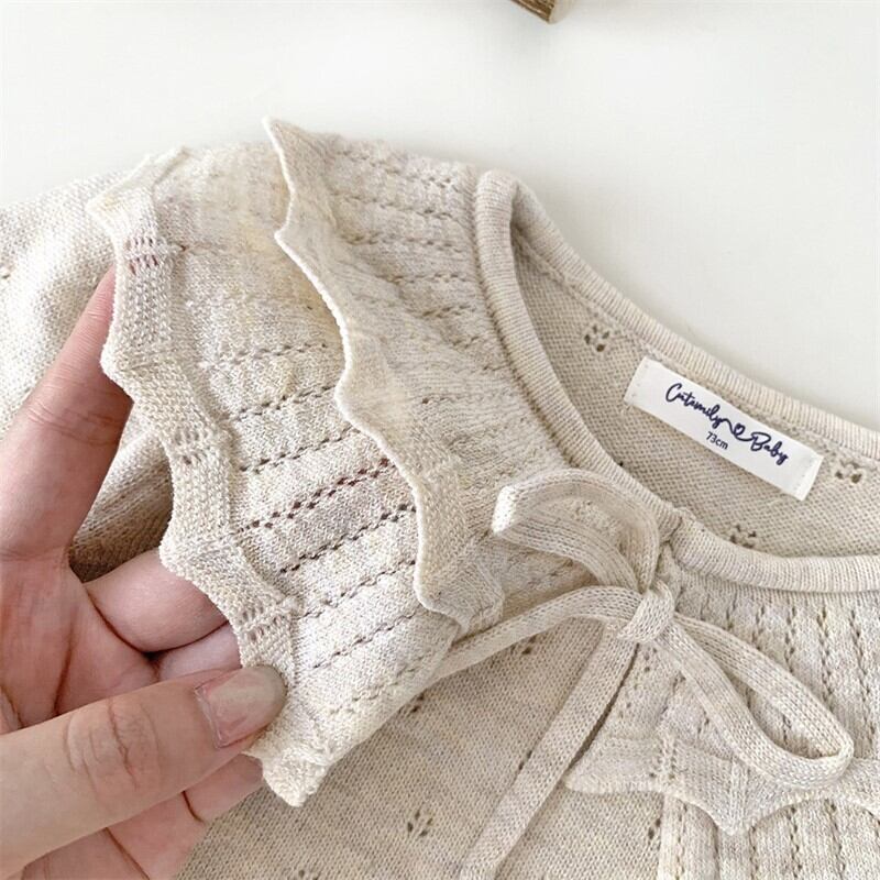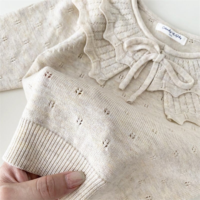 透かし編みのニット素材を使用しており、柔らかく心地よい着用感が特徴です。