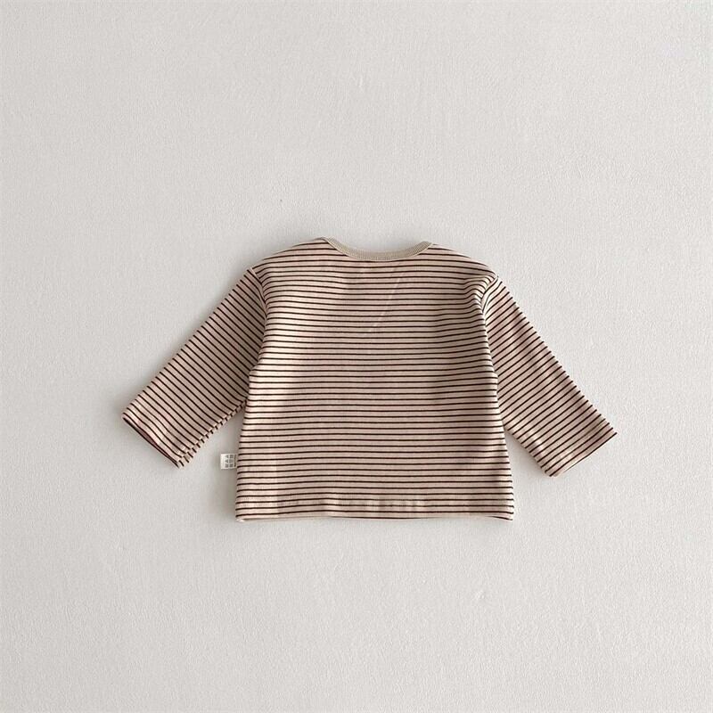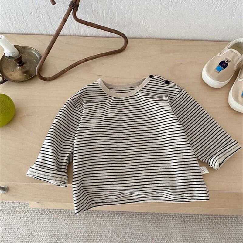 モダンなストライプ柄が特徴的なこのトップスは、首元にボタンが付いており、着脱も簡単に行えます。おしゃれなデザインで、さまざまなカジュアルスタイルにマッチするアイテムです。ストレッチが効いた生地なので、お子様の遊び用にもぴったりです!