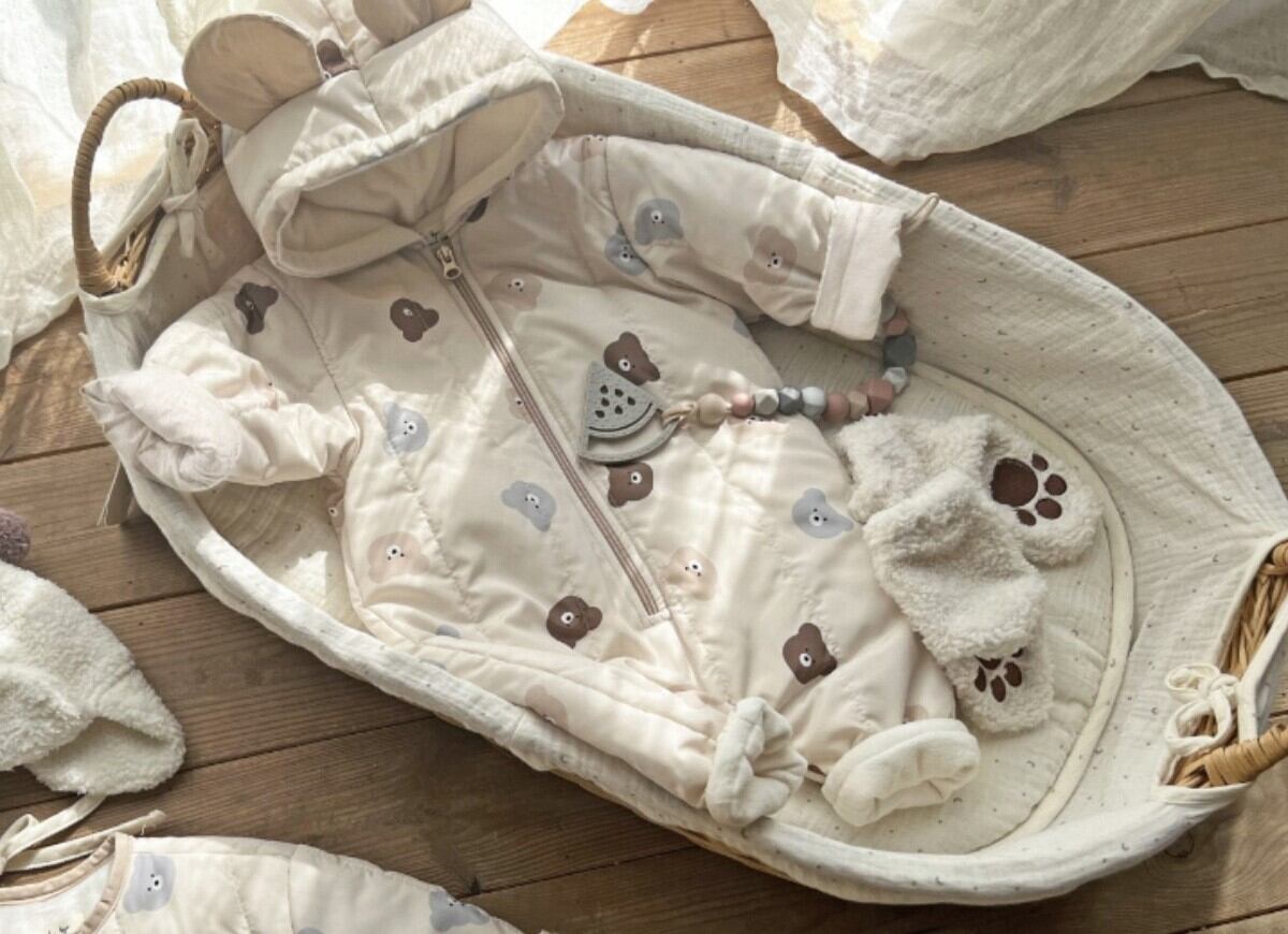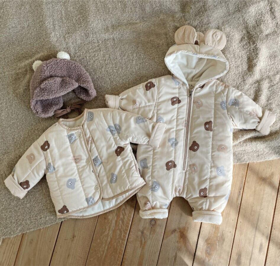 クマちゃん柄が可愛い、赤ちゃん用ジャンプスーツの登場です。