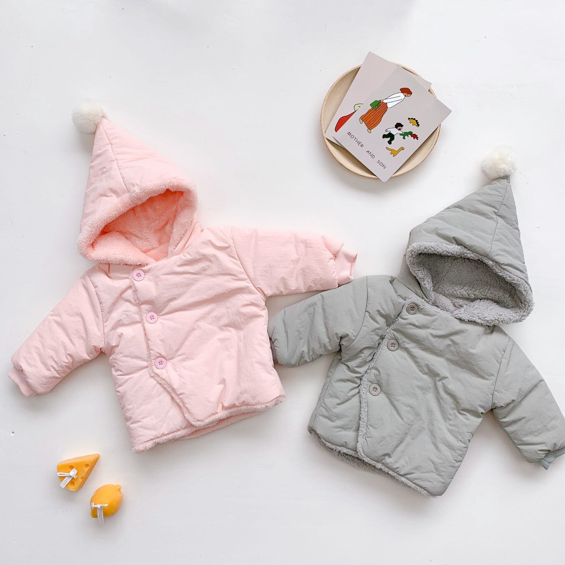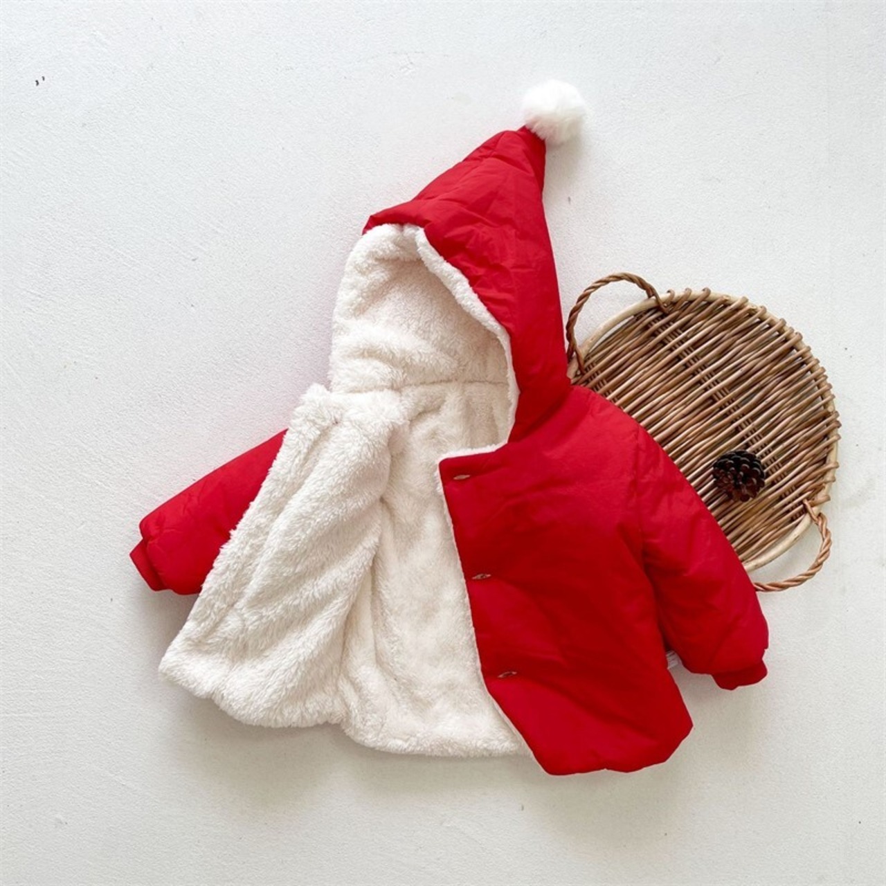 ぽんぽんが可愛いフード付き中綿コートの登場です。