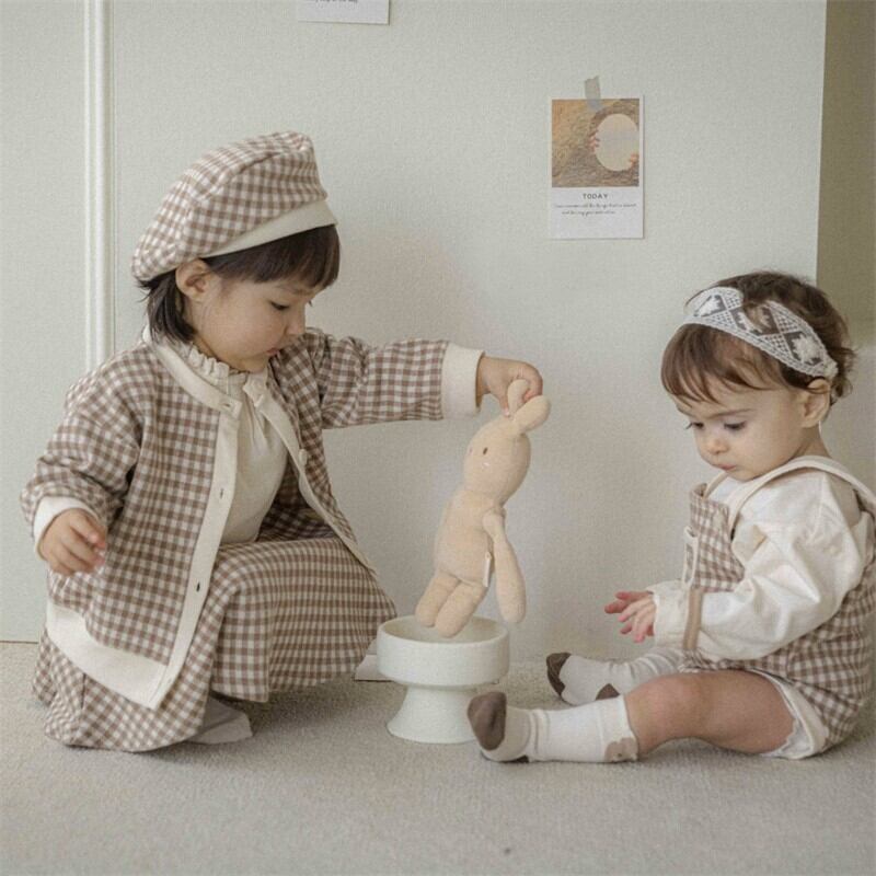 チェック柄ロンパースやセットアップと共布のベレー帽です。