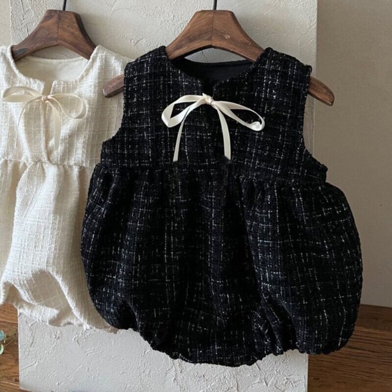 ツイード素材と胸元のリボンが魅力のロンパース!