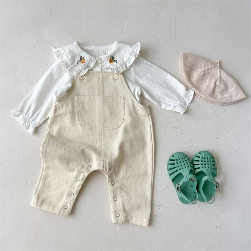 デニム素材でカジュアルながらも、ビッグカラーブラウスのインナーがアクセントとなり、女の子らしい印象を与えます♪